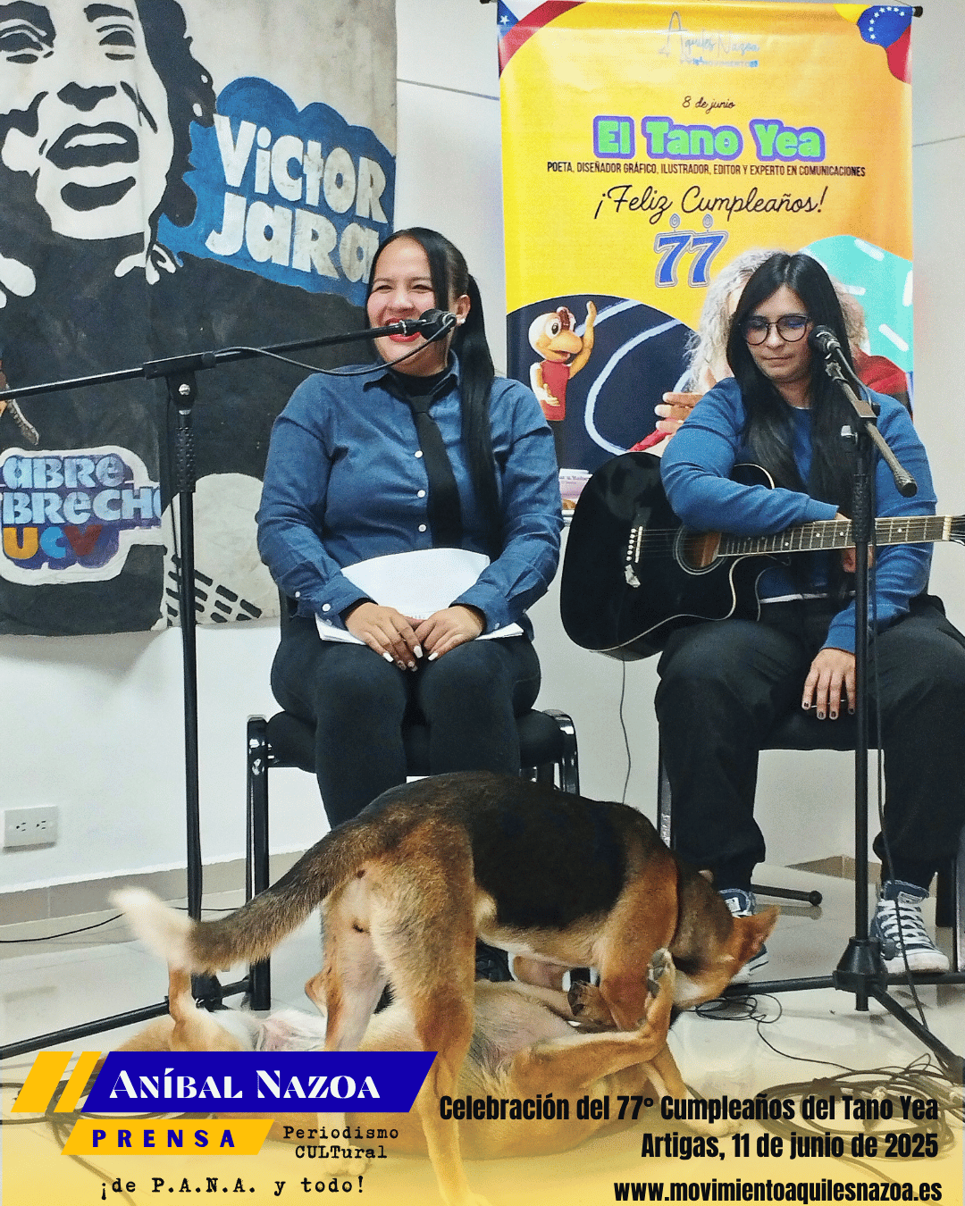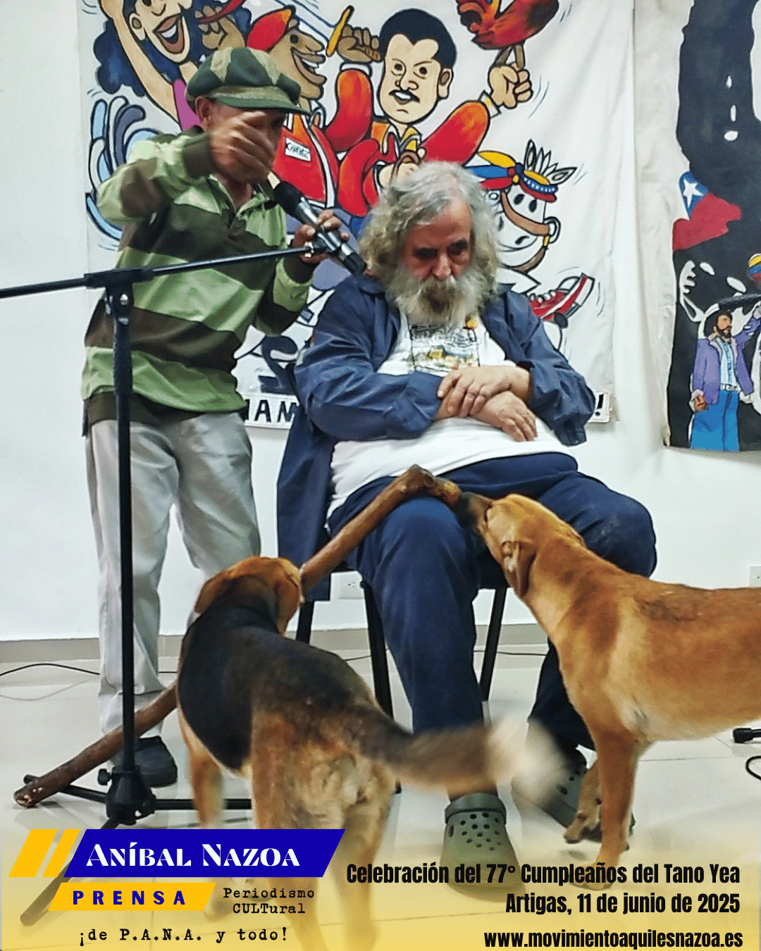 En medio de esta atmósfera de cariño, “El Tano” compartió conmovido (y rodeado por sus inseparables compañeras caninas Canela y Pimienta) anécdotas que tocaron el corazón de todos. “Soy un consentido de Venezuela. Me involucré en las luchas de acá. Estoy contento de haberme venido”, expresó con esa humildad que lo caracteriza, recordando cómo un consejo del periodista Senén Conejeros lo trajo a esta tierra en julio de 1977, junto a su entonces esposa Marlich Riesco García y su hijo Pablo Diego, hoy reconocido muralista con el nombre de “Kalaka”.