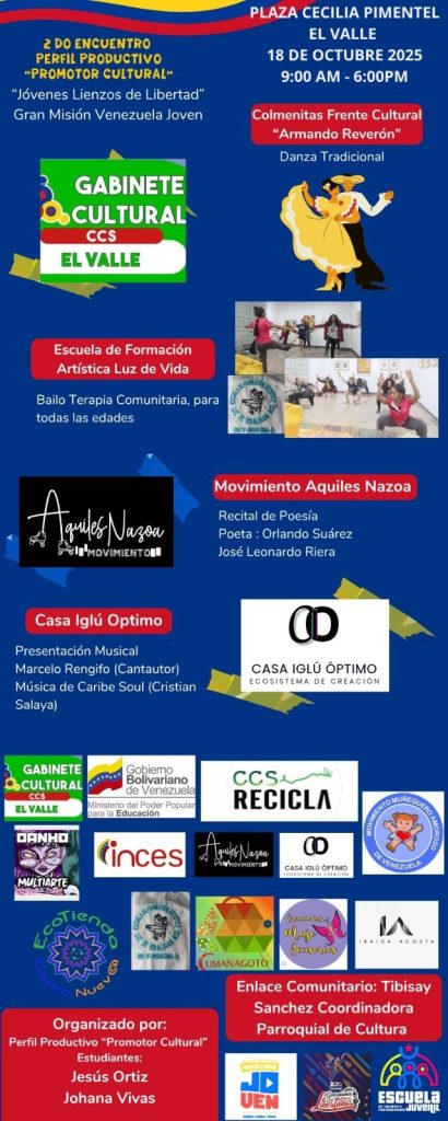 «Jóvenes, Lienzos de Libertad» es un espacio transformador que convierte el talento artístico en una herramienta de cambio comunitario y equilibrio planetario. Este 2do Encuentro no solo forma artistas, sino una nueva generación de ciudadanos y emprendedores conscientes que tienen la capacidad de construir un futuro donde la cultura, la producción y la conservación ecológica se entrelazan. Si este proyecto te parece tan inspirador como a nosotros, te invitamos a que nos acompañes este sábado 18 de octubre de 2025, en la Plaza Cecilia Pimentel de El Valle, a partir de las 9:00am y hasta las 6:00pm, en la realización de este 2do Encuentro Cultural Productivo «Jóvenes Lienzos de Libertad», resultado de estos jóvenes y demostración contundente de cómo la cultura se convierte en acción.