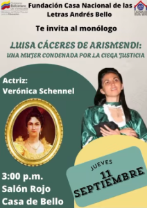 La Fundación Casa Nacional de las Letras «Andrés Bello» te invita a adentrarte en un viaje al pasado con el monólogo teatral «Luisa Cáceres de Arismendi: Una mujer condenada por la ciega justicia».