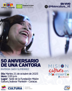 Celebra 50 años de carrera de Daisy Gutiérrez, La Cantora Cumanesa, defensora del canto popular venezolano. Conéctate al Podcast Misión Cultura este 21 de octubre de 2025.